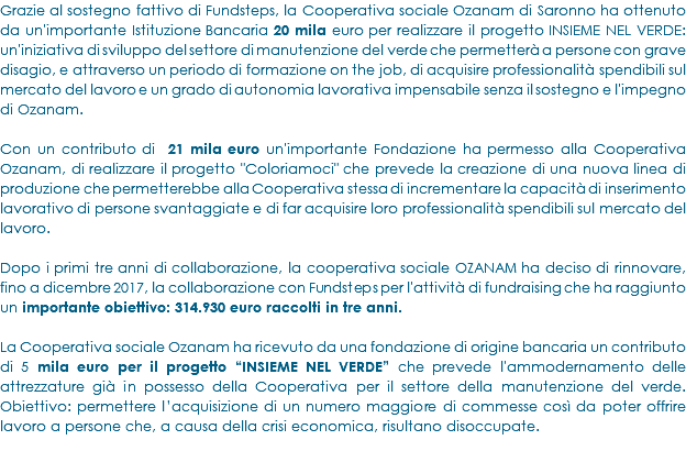 Grazie al contributo di Fundsteps, la Cooperativa sociale Albero del Pane ha ricevuto un contributo di 30 mila euro da una Fondazione Bancaria per la realizzazione del progetto "Il futuro lo costruiamo insieme!" che prevede attività formative e di tirocinio lavorativo per ragazze e ragazzi in situazione di grave disagio sociale.